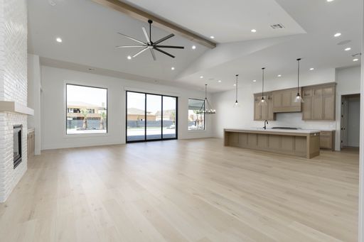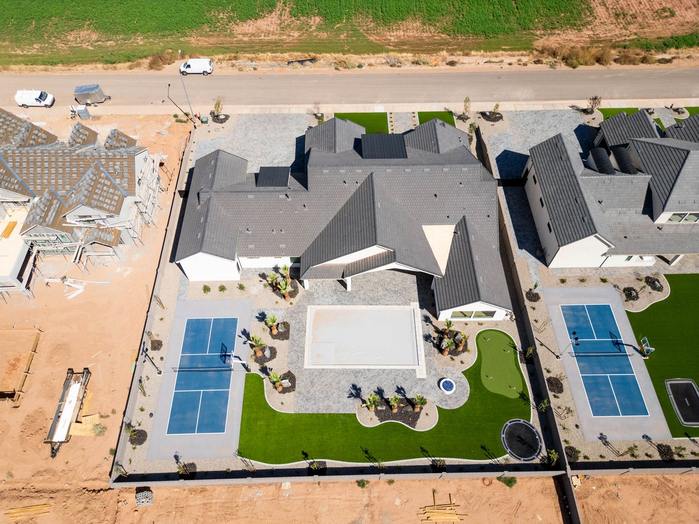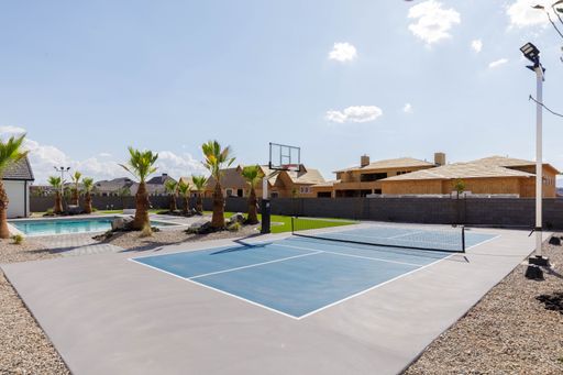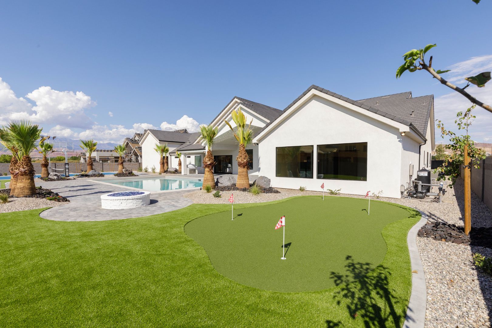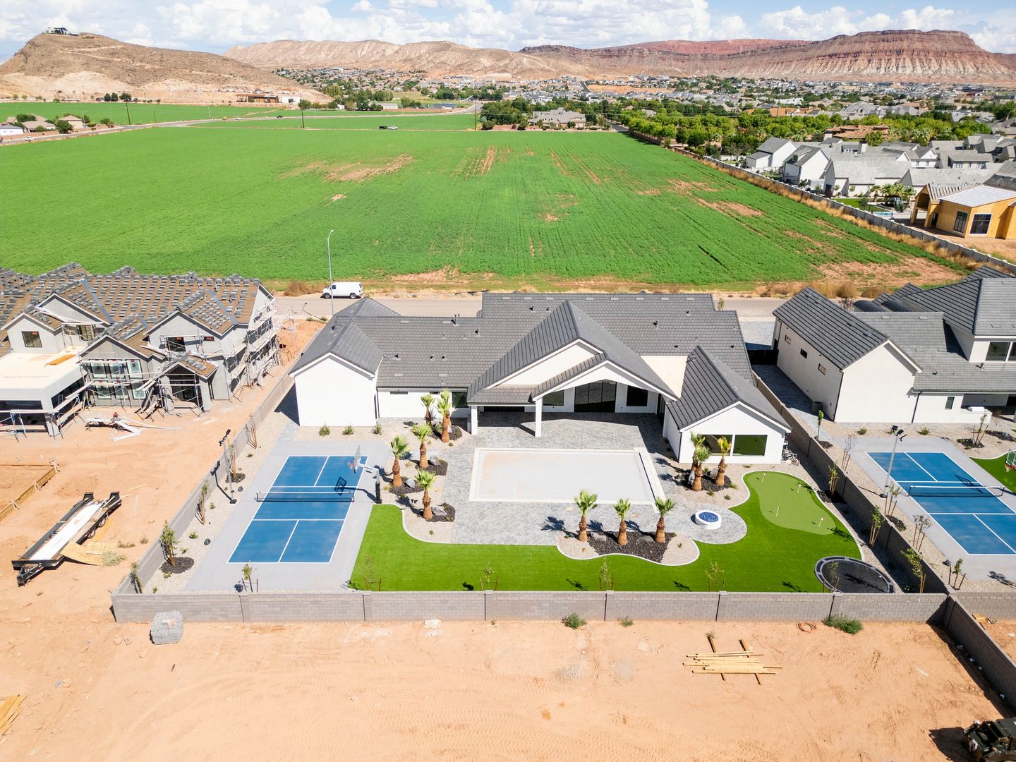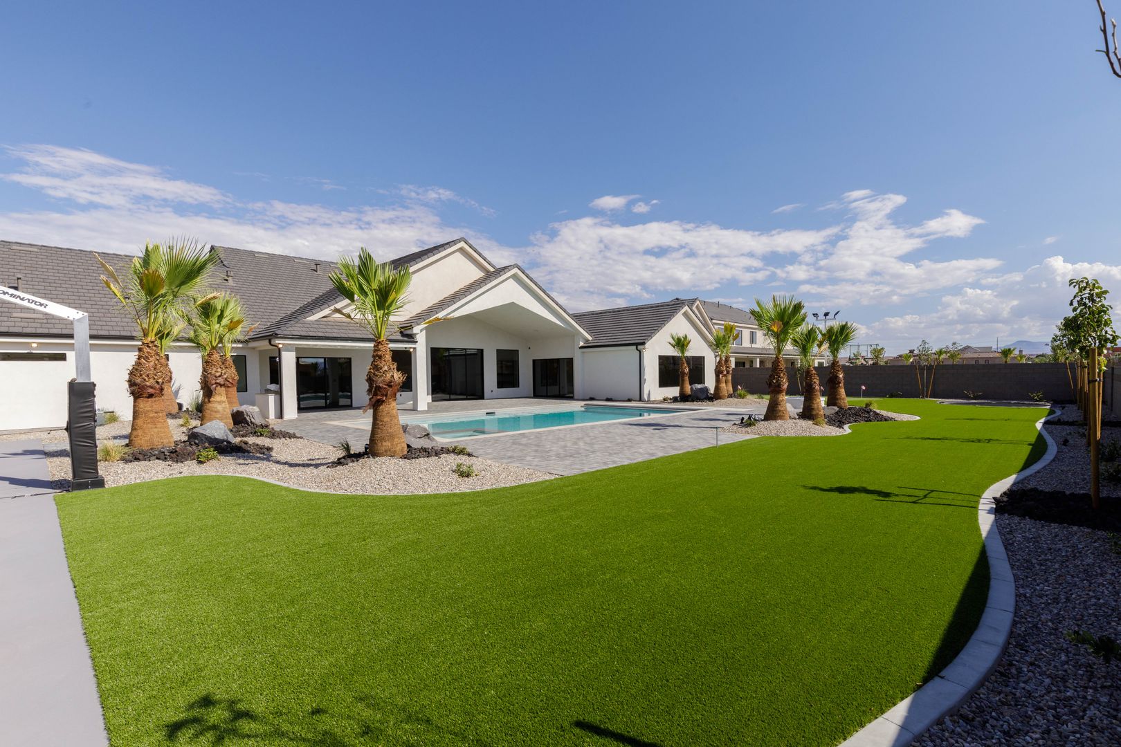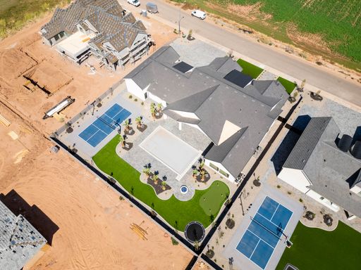 Absolutely stunning single-level estate by New Trend Construction, situated on an expansive lot of over half an acre. This custom-designed property boasts a true backyard oasis complete with a saltwater pool and integrated spa, motorized pool cover, professional-grade outdoor chef's kitchen, gazebo, pickleball and basketball court, and an upgraded in-ground trampoline--perfect for entertaining or private resort style living. Inside, the thoughtfully designed floor plan spans over 5,000 sq ft all on one level--a rare find. The open-concept living area features soaring vaulted ceilings and a gourmet kitchen equipped with a GE Monogram appliance package, built-in fridge/freezer, dual dishwashers, and an oversized butler's pantry to meet the highest culinary standards.