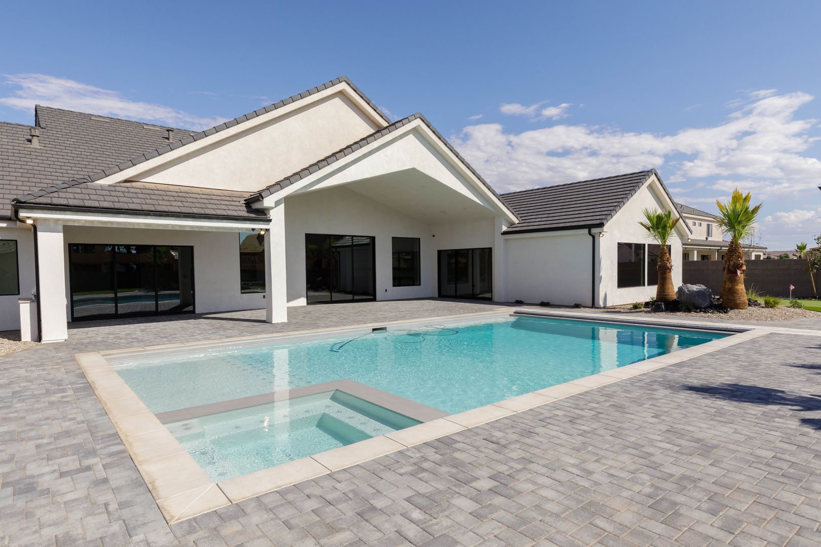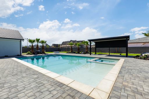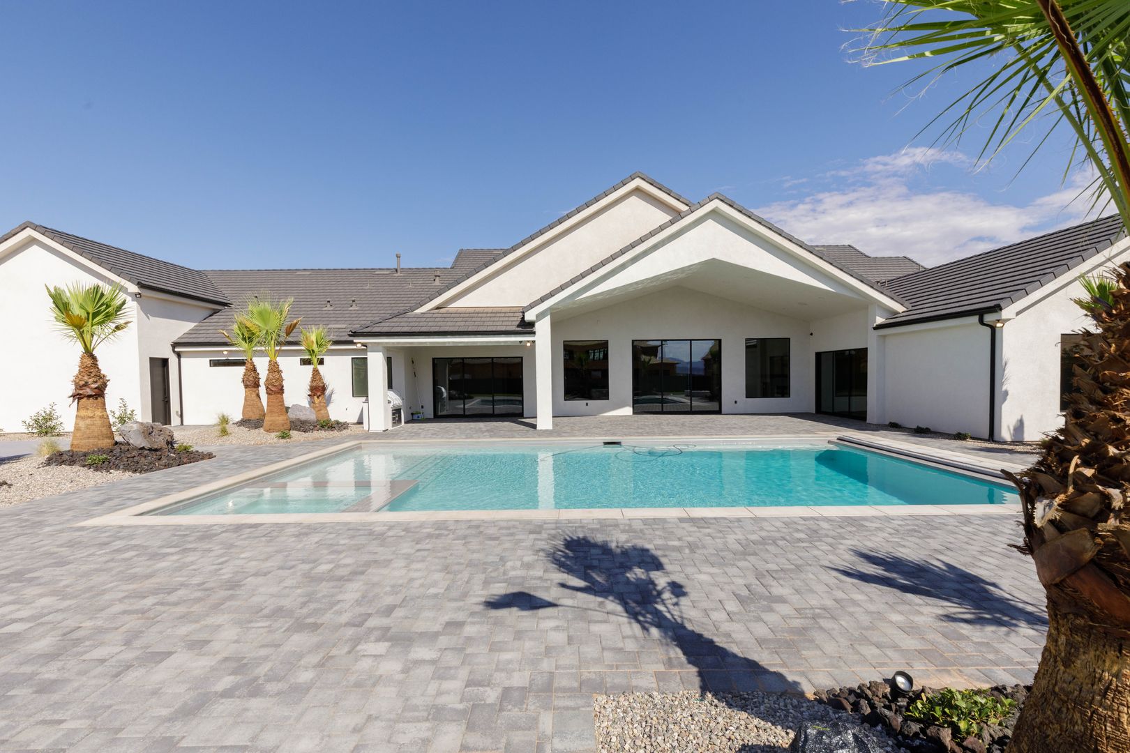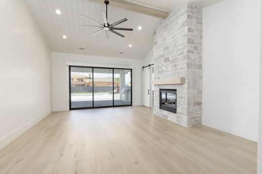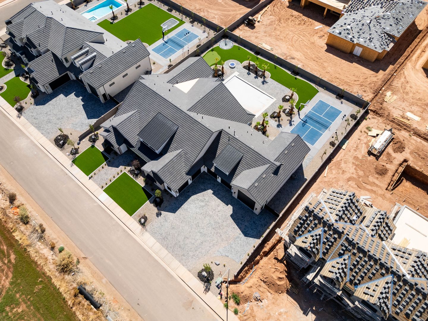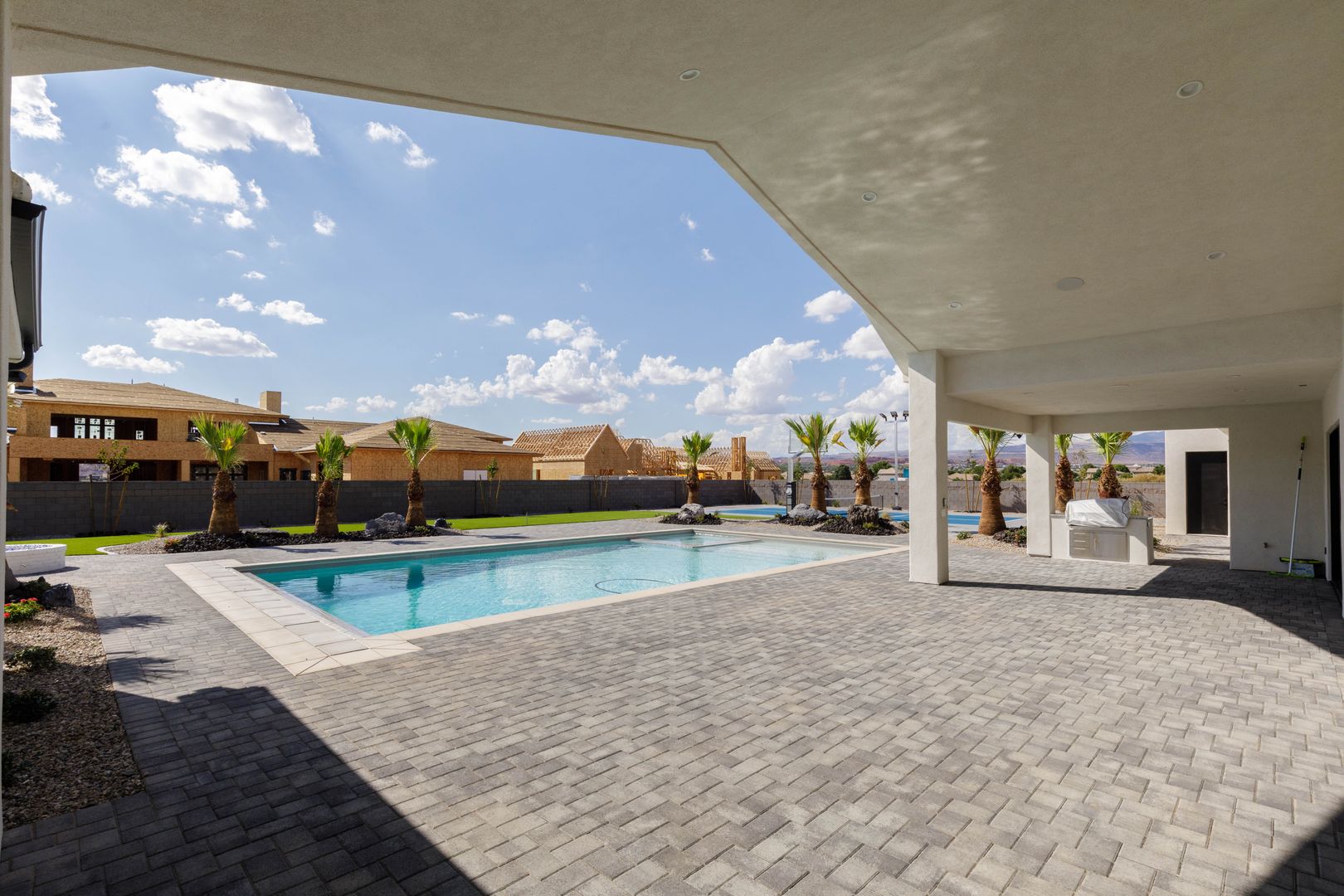 Absolutely stunning single-level estate by New Trend Construction, situated on an expansive lot of over half an acre. This custom-designed property boasts a true backyard oasis complete with a saltwater pool and integrated spa, motorized pool cover, professional-grade outdoor chef's kitchen, gazebo, pickleball and basketball court, and an upgraded in-ground trampoline--perfect for entertaining or private resort style living. Inside, the thoughtfully designed floor plan spans over 5,000 sq ft all on one level--a rare find. The open-concept living area features soaring vaulted ceilings and a gourmet kitchen equipped with a GE Monogram appliance package, built-in fridge/freezer, dual dishwashers, and an oversized butler's pantry to meet the highest culinary standards.