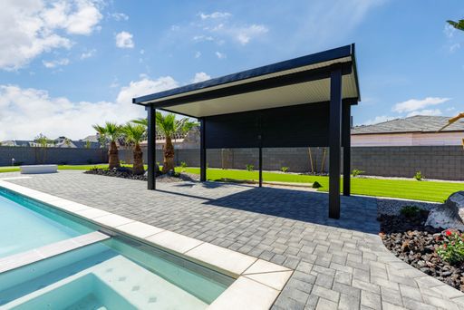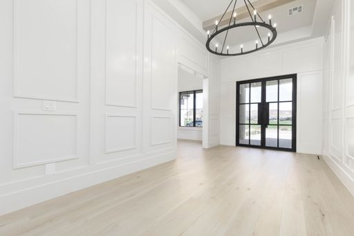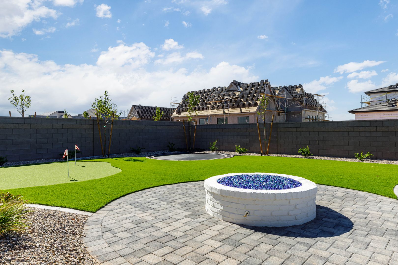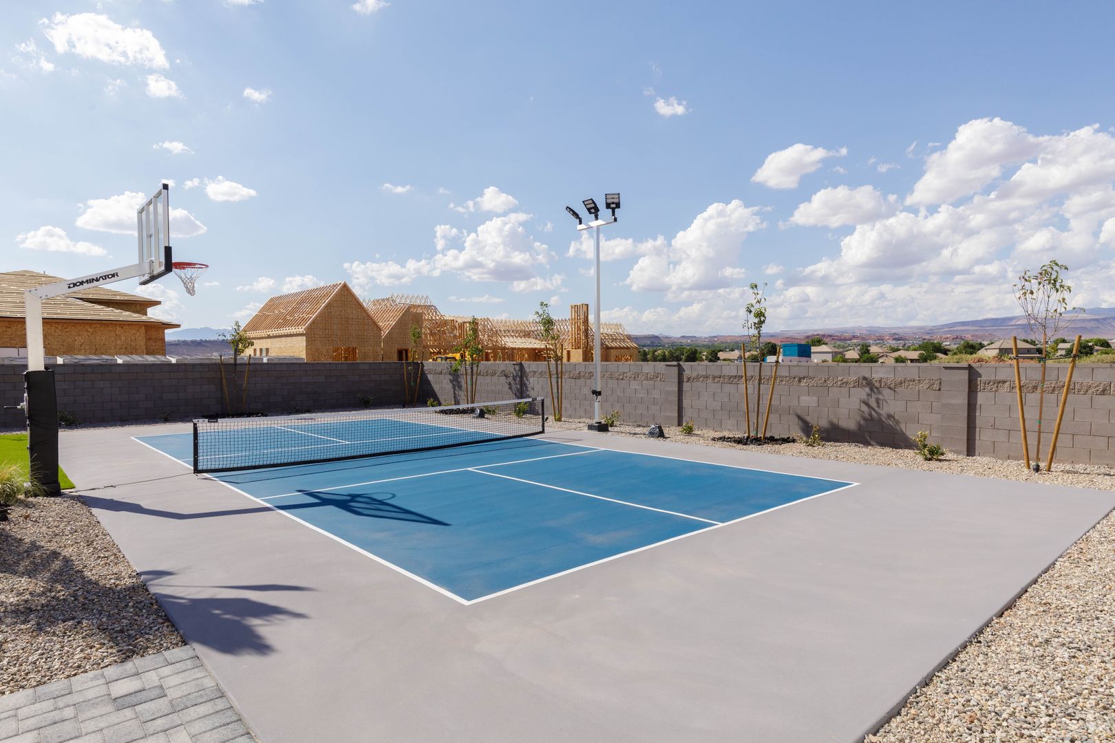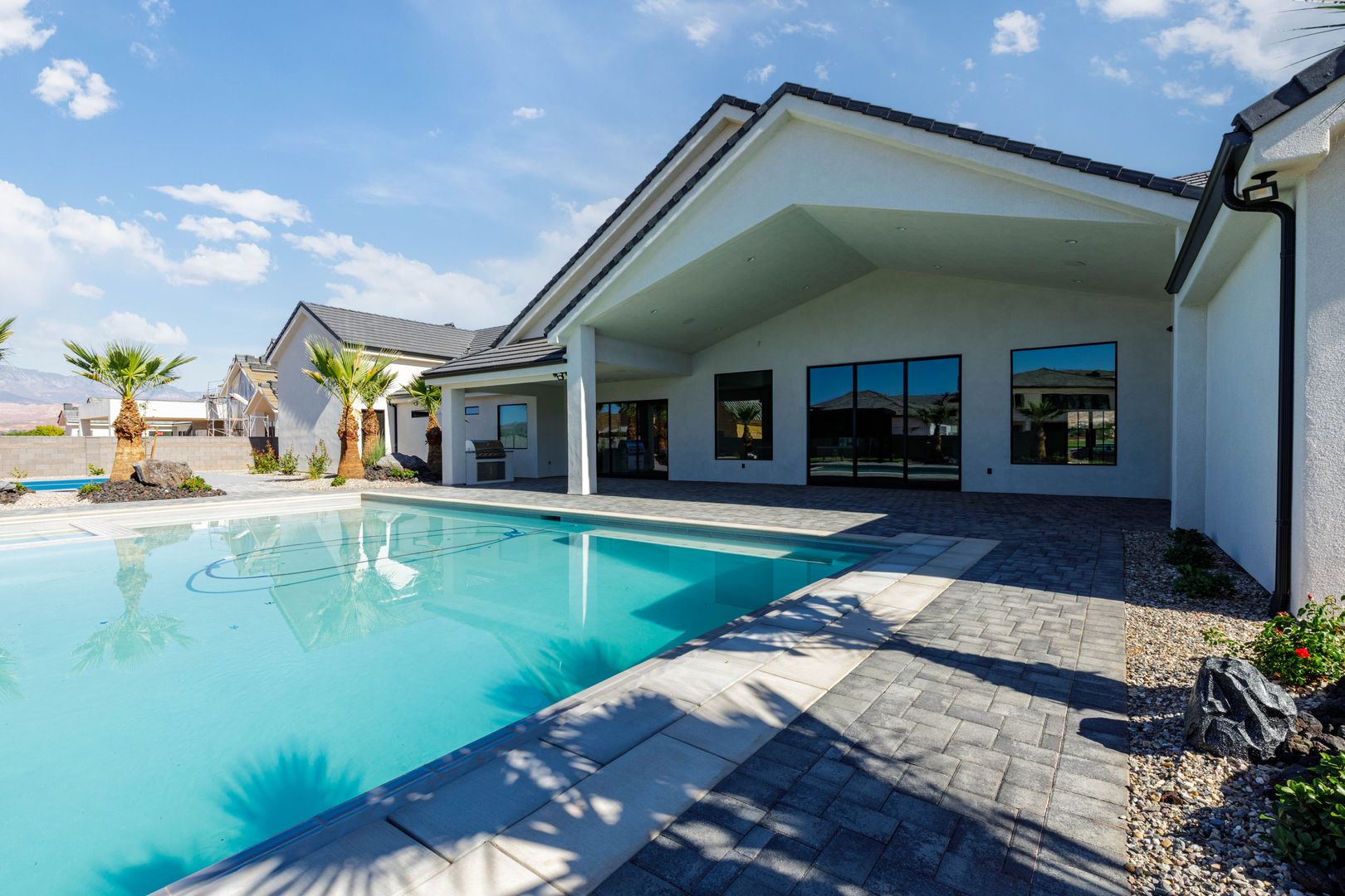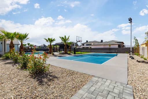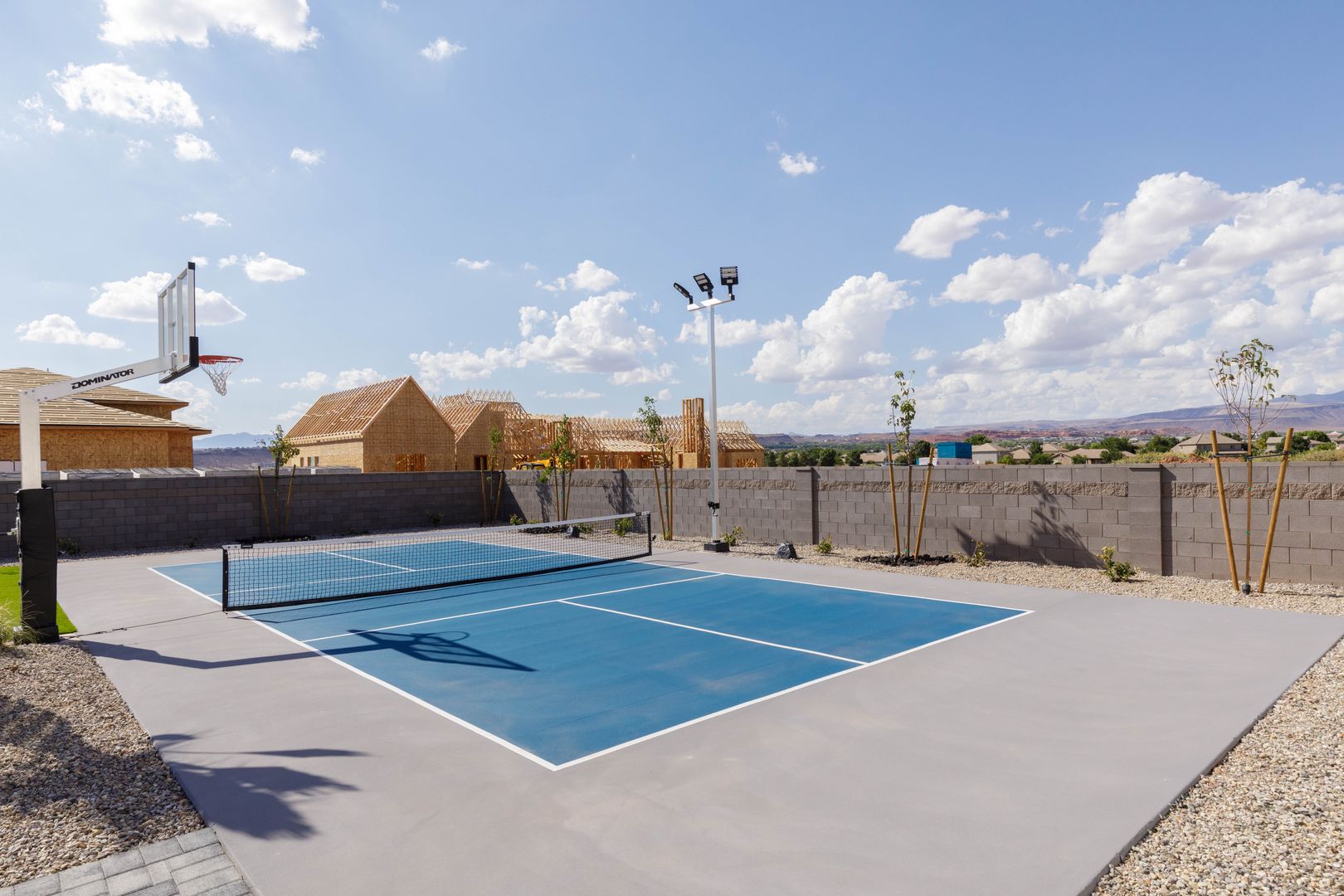 Absolutely stunning single-level estate by New Trend Construction, situated on an expansive lot of over half an acre. This custom-designed property boasts a true backyard oasis complete with a saltwater pool and integrated spa, motorized pool cover, professional-grade outdoor chef's kitchen, gazebo, pickleball and basketball court, and an upgraded in-ground trampoline--perfect for entertaining or private resort style living. Inside, the thoughtfully designed floor plan spans over 5,000 sq ft all on one level--a rare find. The open-concept living area features soaring vaulted ceilings and a gourmet kitchen equipped with a GE Monogram appliance package, built-in fridge/freezer, dual dishwashers, and an oversized butler's pantry to meet the highest culinary standards.